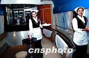 四月十七日晚十八點五十三分,中國鐵路第五次提速開始。新開行的十九對直達特快列車中,北京開往杭州的Z9次首先發車。圖為新提速火車的餐車酒吧、茶吧寬敞舒適,旅客還可以要求送餐、點餐服務。