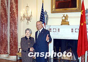 美國國務卿鮑威爾當地時間4月22日在美國國務院會見前來主持并參加中美商貿聯委會的中國國務院副總理吳儀。中新社記者:余東暉