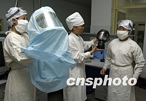 北京地壇醫院重癥監護室(ICU)的護士,穿戴好防護裝準備進入收治SARS疑似患者的病房。地壇醫院是北京市權威的老資格傳染病醫院,在2003年承擔了眾多SARS患者的治療搶救重任,并在2003年8月將去年全國最后一名SARS患者治愈。中新社記者:任晨鳴