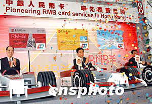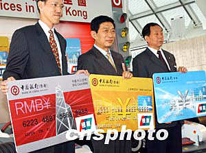 中國銀行(香港)有限公司四月二十九日在香港正式宣布,于四月三十日率先推出中銀人民幣卡系列,包括中銀人民幣信用卡和中銀卡(人民幣),設有普通卡和金卡,卡面印有"銀聯"標志,可用于“銀聯”遍布全國多個省市約40萬個商號網點。人民幣信用卡亦可用于香港貼有“銀聯”標志及香港地區的中銀香港、南洋商業銀行及集友銀行屬下的自動柜員機24小時提取人民幣或港幣的便利服務。“中銀人民幣卡系列”啟動儀式。作者:錢興強