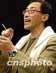 香港話劇團2004/05年春夏劇第一炮《桃花扇》,四月二十九日舉行宣傳活動,該劇將于五月中旬在在香港大會堂劇院上演,圖為香港話劇團藝術總監毛俊輝為該劇造勢。 作者:錢興強