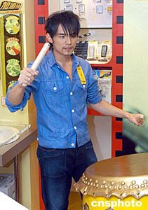 臺(tái)灣人氣偶像歌星周杰倫5月7日在香港出席其代言廣告One2free灣仔新店開(kāi)幕,周杰倫并以打鼓助慶。作者:鄧慶樂(lè)