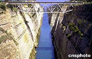 科林斯運河位于希臘首都雅典西南與伯羅奔尼撒半島地峽處,完成于1893年,長6公里,寬23米,河面距地面橋梁深達約80米,如利刃將半島與大陸筆直地切開。該運河由拖輪牽引仍可通過萬噸輪船。作者:田地