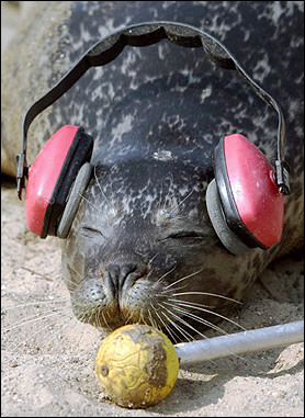 一個正在接受科學研究的14歲海豹頭戴耳機,樣子憨態可掬。