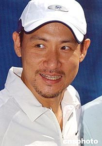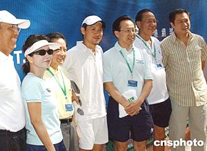 香港影視紅星張學友與著名音樂人區丁玉,五月九日代表香港明星隊參加在香港舉行的網球團體邀請賽網球雙打組合。