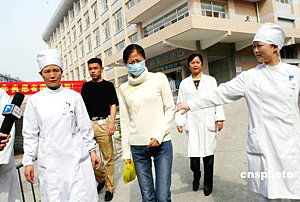 2004年5月10日上午,安徽首例非典確診患者宋某走出安徽醫科大學第一附屬醫院傳染科病房。該非典確診患者經安徽省和醫院專家組會診后,認為其已符合傳染性非典型肺炎治愈出院標準。安徽確診非典患者宋某是安徽醫科大學的女碩士研究生,4月4日由淮南礦工二院轉入安醫大附院。至5月7日,安徽省SARS患者的全部115名密切接觸者已全部解除隔離醫學觀察,沒有出現一例異常情況。至此,安徽省已無非典病人及接觸非典而進行隔離醫學觀察人員。劉兵生 攝