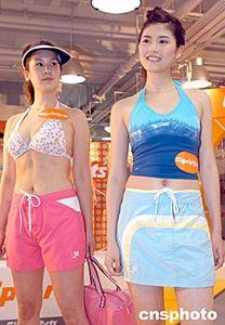 樂壇新星官恩娜(右)、歌星陳見飛5月12日在香港出席全港最大的運動專門店GigaSports SuperStore開幕,兩人客串模特展示最新泳裝。  Maggie Q獲GigaSports頒發「健康有個性完美體態之星」獎項。作者:鄧慶樂