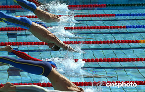 圖為在當地時間8月19日舉行的游泳比賽中,各選手入水瞬間。