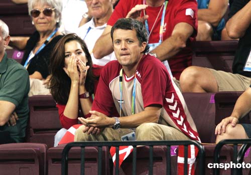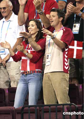 圖為丹麥王儲弗雷德里克攜王妃瑪麗來到奧運比賽現場,觀看當地時間19日舉行的手球預賽,該比賽在丹麥與西班牙之間進行。