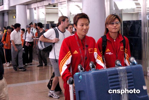 八月二十日下午四時,在雅典奧運會遭受空前挫折的中國女足返抵北京首都機場,女足隊員與教練步出機場之際,濃濃的悲愴之情籠罩候機大廳。圖為國家體育總局有關領導前往機場迎接。作者:徐曦弋