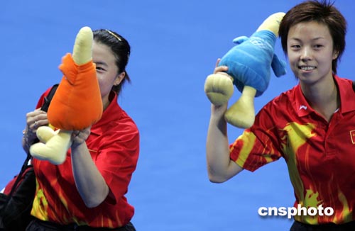 當(dāng)?shù)貢r(shí)間8月20日下午,中國(guó)乒乓球選手王楠、張怡寧在決賽中以4比0輕取韓國(guó)選手,獲得本屆奧運(yùn)會(huì)女子雙打冠軍。中新社記者:任晨鳴