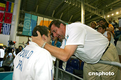 圖為在法國隊奪取男子配劍團(tuán)體冠軍后,法國體育部長拉穆爾擁抱選手的場面。