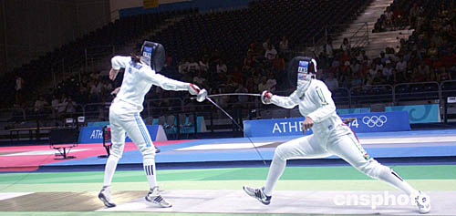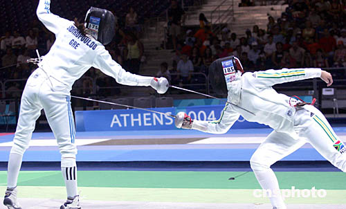 圖為在當地時間8月20日舉行的女子擊劍比賽中,希臘選手和南非共和國選手展開激烈對攻。