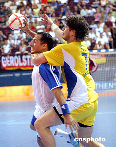 圖為在當地時間8月20日舉行的男子手球比賽中,巴西隊與希臘隊比賽的場面。最后巴西隊22比26不敵希臘隊。