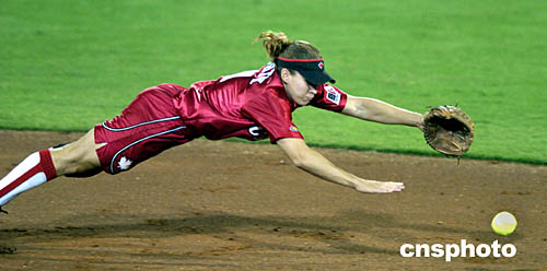 圖為在當地時間8月19日舉行的加拿大和澳大利亞壘球比賽中,加拿大選手的精彩表現。