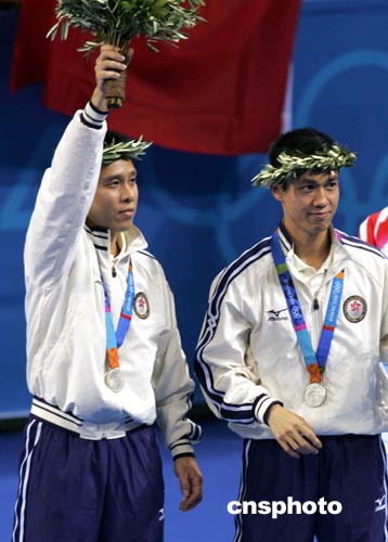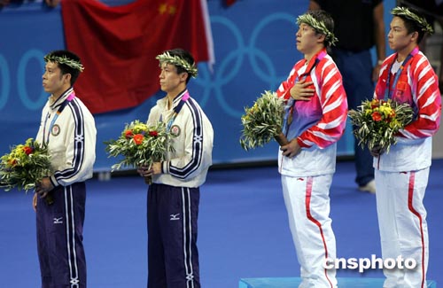 雅典當地時間8月21日下午,中國乒乓球選手馬琳、陳玘在男雙決賽中以4比2戰勝香港選手李靜、高禮澤,獲得本屆奧運會男子雙打冠軍。中新社記者:任晨鳴