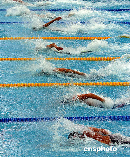 圖為在男子50米自由泳比賽中,選手們奮力拼搏,暢游泳池的鏡頭。