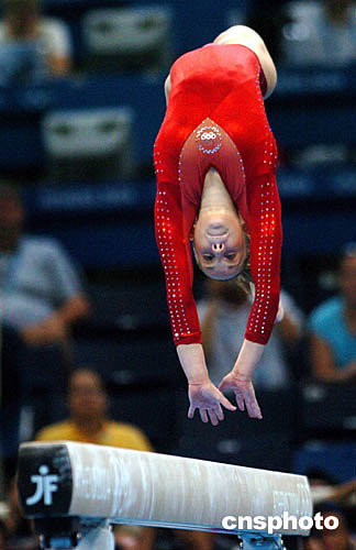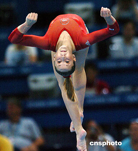 美國選手卡莉(PATTERSON CARLY)在奧運會體操女子全能比賽中,以38.387分獲得金牌。圖為她在比賽時的表現。