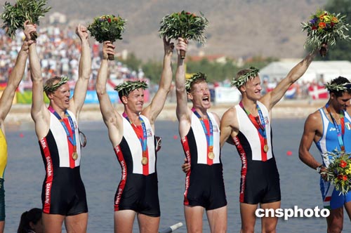 當(dāng)?shù)貢r間八月二十二日,丹麥選手獲得雅典奧運(yùn)男子四人單槳賽艇比賽冠軍。中新社記者:毛建軍