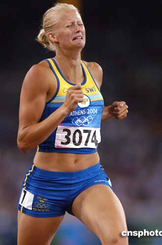 圖為當地時間8月21日,瑞典選手克魯夫特在女子七項全能比賽中獲得金牌后,激動得落下眼淚。