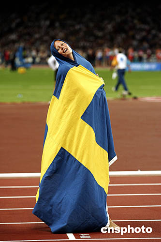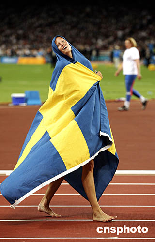 圖為瑞典選手克魯夫特(Kluft Carolina)在獲得女子七項(xiàng)全能冠軍后,身披國旗以示慶祝的畫面。