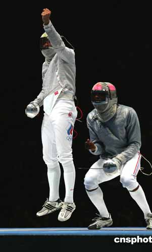 在當(dāng)?shù)貢r(shí)間19日舉行的男子佩劍團(tuán)體三、四名決賽中,俄羅斯選手Serguei Charikov(左)在戰(zhàn)勝美國選手Ivan Lee后,表現(xiàn)十分激動(dòng)。