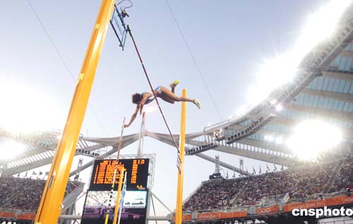 圖為當地時間21日舉行的女子撐竿跳資格賽比賽現場。