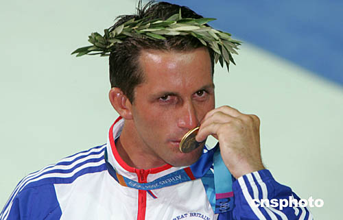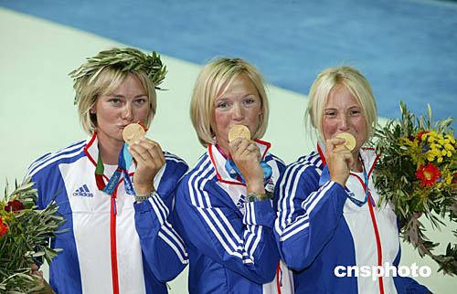 圖為英國運動員本·安斯利(Ben Ainslie)和英國選手arah Webb, skipper Shirley Robertson,Sarah Ayton在奪得帆船芬蘭人級比賽和三人女子龍骨船-鷹鈴級帆船比賽冠軍后親吻金牌的場面。