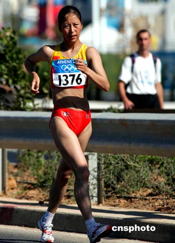 當?shù)貢r間8月23日上午,在雅典奧運會女子20公里競走比賽中,中國老將王麗萍僅獲得第八名。中新社記者:張煒