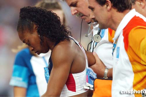 在當地時間22進行的女子100米跨欄比賽中,美國選手Gail Devers因摔倒而不得不離開賽場。