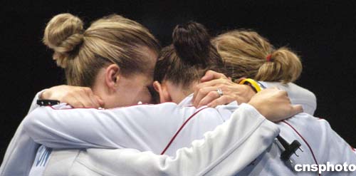 當地時間22日,加拿大在同法國爭奪銅牌的擊劍團體比賽中失敗。圖為賽后她們相互擁抱的場面。