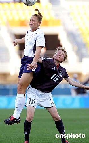 圖為在當(dāng)?shù)貢r間8月23日的女足比賽中,美國隊3號選手Christie RAMPONE頭球出色。
