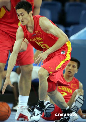 中國男籃在雅典奧運會小組賽最后一場比賽中以一分險勝世界冠軍塞黑隊闖入前八名,以替補大前鋒出戰的杜鋒(15號球衣)表現喜人,在最后關頭鎖定勝局。中新社記者:任晨鳴