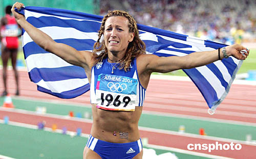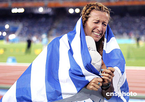 圖為希臘選手Hrysopiyi DEVETZI在獲得女子三級跳遠亞軍后慶祝的場面。