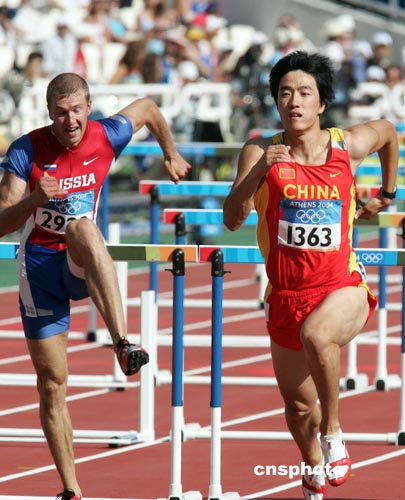 當地時間八月二十四日,中國著名田徑選手劉翔(右)亮相雅典奧運賽場,在男子一百一十米跨欄預賽中,以十三秒二七的成績名列小組第一進入第二輪預賽。中新社記者:毛建軍