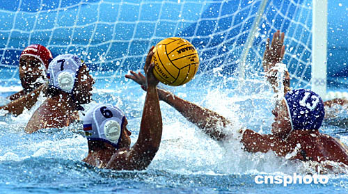 圖為在當(dāng)?shù)貢r間8月23日舉行的埃及隊和西班牙隊的水球比賽畫面。