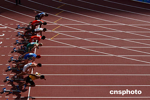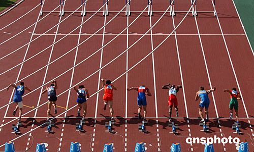 圖為在當地時間8月24日舉行的男子十項全能110米欄比賽中,選手們起跑時的鏡頭。