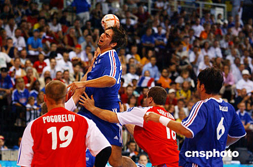 圖為在當地時間8月24舉行的男子手球法國隊與陣俄羅斯隊的1/4決賽中,法國隊Nikola Karabatic的精彩表現。