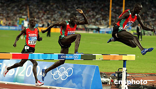 圖為在男子3000米障礙賽中,肯尼亞選手Brimin Kipruto和他的同胞Ezekiel Kemboi和Paul Kipsiele Koech的出色表現。