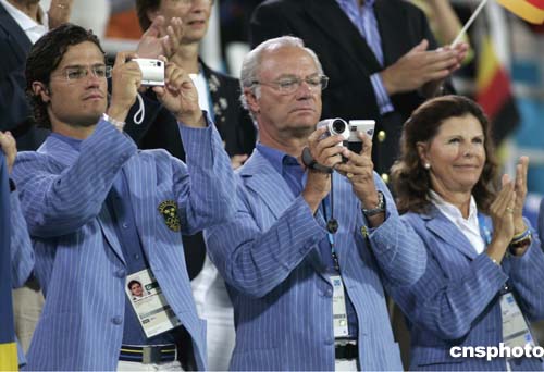 在當(dāng)?shù)貢r間24日舉行的馬術(shù)障礙賽團(tuán)體賽頒獎典禮上,瑞典國王Carl Gustav,王后Silvia和菲利普王子用微型攝像機(jī)拍攝頒獎的場面。