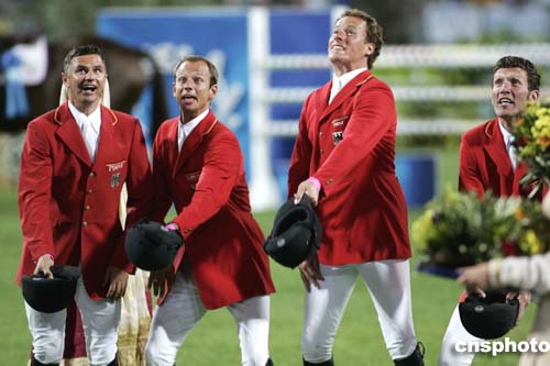 在當地時間8月24日進行的馬術障礙賽團體賽中,德國隊榮獲第一,這是他們的隊員Otto Becker, Marco Kutscher,Christian Ahlmann和Ludger Beermaun(從左到右)慶祝的場面。
