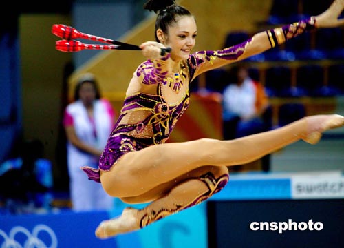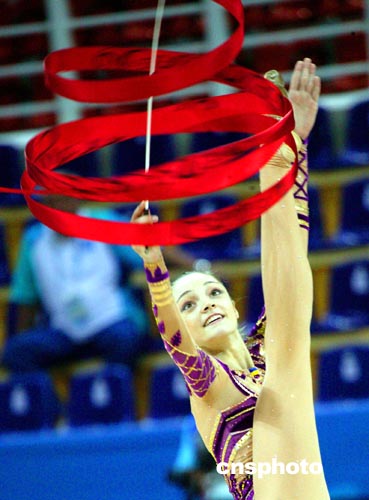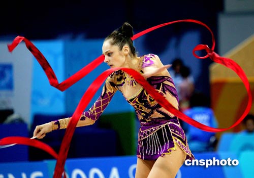 雅典當(dāng)?shù)貢r(shí)間八月二十五日,俄羅斯藝術(shù)體操個(gè)人全能選手KABAEVA進(jìn)行奧運(yùn)會(huì)賽前排練。中新社記者:王瑤