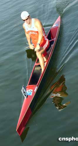 圖為RICHARD DALTON在結(jié)束了男子皮劃艇1500米半決賽后駛向岸邊的情景。他在該比賽中獲得第三名,取得了決賽資格。