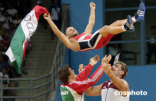 圖為匈牙利選手毛約羅什(Istvan Majoros)在雅典奧運(yùn)會(huì)摔跤男子55公斤級(jí)決賽中奪冠后慶祝的場面。