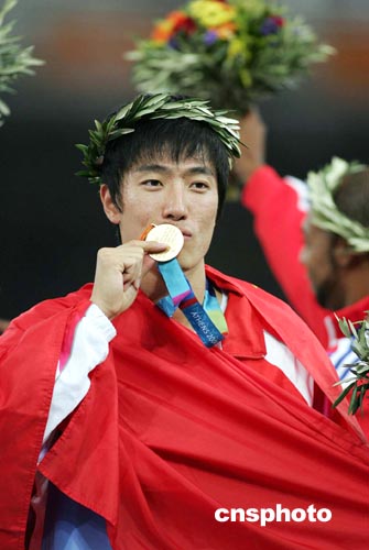 劉翔爆出了本屆奧運會的一個大冷門,本來被認為也就是能沖擊一枚獎牌的他,在一百一十米欄的決賽中跑出了十二秒九一的世界紀錄成績,并輕松奪取奧運金牌。賽后,這位高大、陽光的大男孩高興之余,還和國內外的記者開起了玩笑。