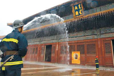 5分鐘后,故宮、府右街、花市三個消防中隊先后趕到。13輛消防車,100多名消防隊員將太廟圍住,四支帶架的高壓水槍像大炮一樣排在大殿的南側。再加上東側和西側的8支水槍,共十多條水龍從空中騰起,撲向大殿。