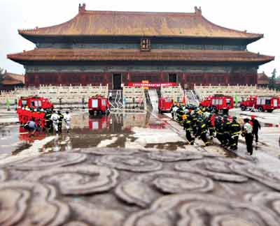故宮消防中隊出動兩名搶險員,搶救被燒物資,同時府右街消防中隊派出兩副擔架,從殿內“火!敝芯瘸鰞擅皞麊T”;ㄊ邢乐嘘牭臄得绬T,在殿內架起兩節梯,從內部滅火。