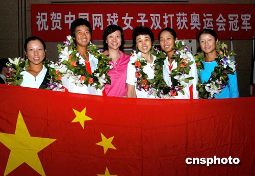 在雅典奧運(yùn)會(huì)網(wǎng)球女子雙打決賽中為中國獲得歷史上首枚網(wǎng)球金牌的李婷、孫甜甜,回國后立即成為人們的偶像,交際活動(dòng)頻繁。圖為新任國家體育總局網(wǎng)球運(yùn)動(dòng)管理中心主任孫晉芳(右三)和她的老女排隊(duì)友楊希(左三),帶著李婷(左二)、孫甜甜(右二)在參加一個(gè)歡迎宴前合影留念。作者:王麗南