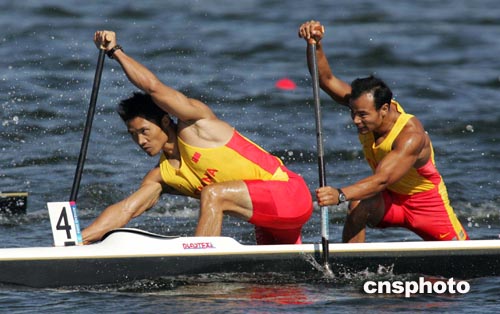 中國軍團繼游泳和田徑之后,在水上項目也喜獲金牌,中國體育的“一一九工程”在雅典實現了突破。中國皮劃艇在奧運會上從未見金的歷史,今天被孟關良、楊文軍改寫,他們在男子雙人劃艇五百米決賽中克服了出發不利的困難,奮起直追,以領先第二名零點零七二秒的微弱優勢奪冠,實現了中國水上項目的歷史性突破。
