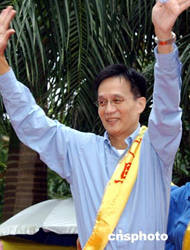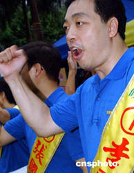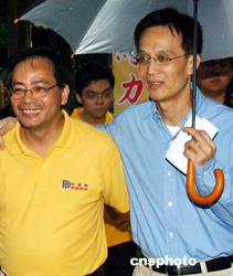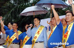 八月二十九日,香港民建聯(lián)舉行2004立法會選舉誓師大會,剛剛手術出院的民建聯(lián)主席馬力與港島區(qū)候選人一起在誓師大會上,為進軍2004立法會選舉造勢。作者:錢興強